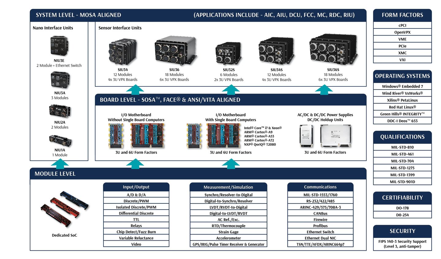 I/O & Communications 2 x 10/100/1000Base-T; RS-232/422/485 (8); MIL-STD-1553 (2); D/S Simulation (3); S/D Measurement (4); AC Reference (2); Discrete I/O (24); CANBus (8); Differential I/O (16); 28 VDC PSU w/holdup